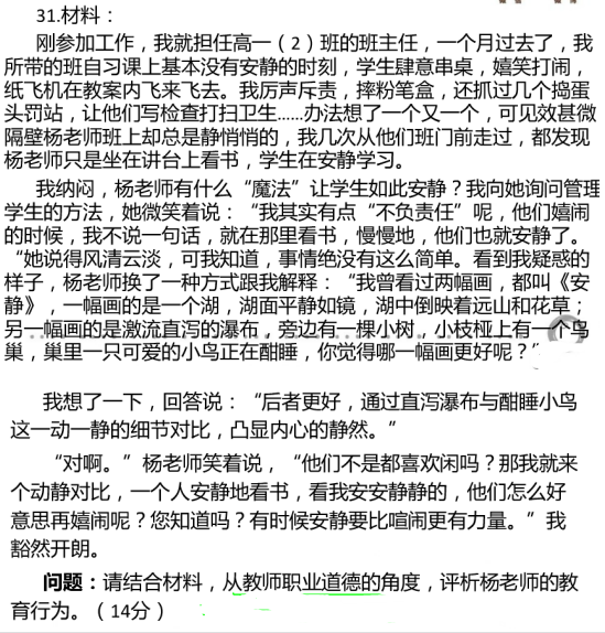 首先,杨老师的行为体现了教书育人的道德规范。教书育人要求教师做到遵循教育规律,实施素质教育。循循善诱,诲人不倦,因材施教。材料中,杨老师针对学 生的管理纪律方面的做法符合学生的身心发展规律,利用动与静对比的方式更容易引起学生注意,形成学生自律的品质。所以体现了教书育人的道德规范。